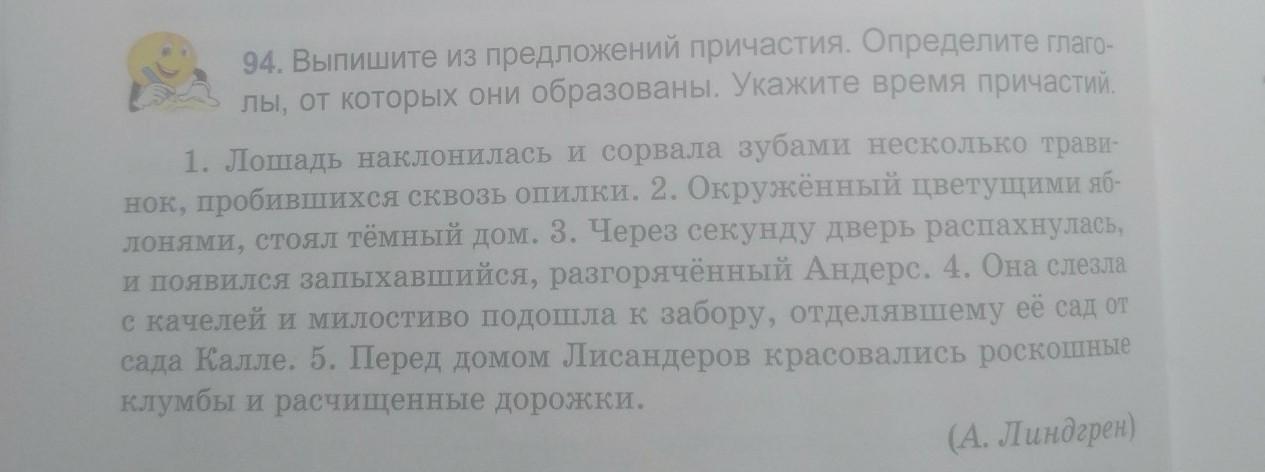 выпишите из предложений причастия. Отпрелелите глаголы, от которых они образованы. Укажите время причастий