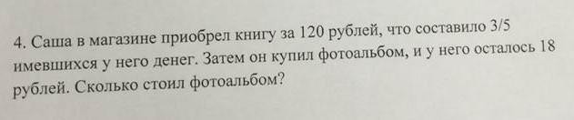 1)120:3*5=200-было денег .2)200-120=80 3)80-18=62-стоил фотоальбом Ответ:62 рубля.