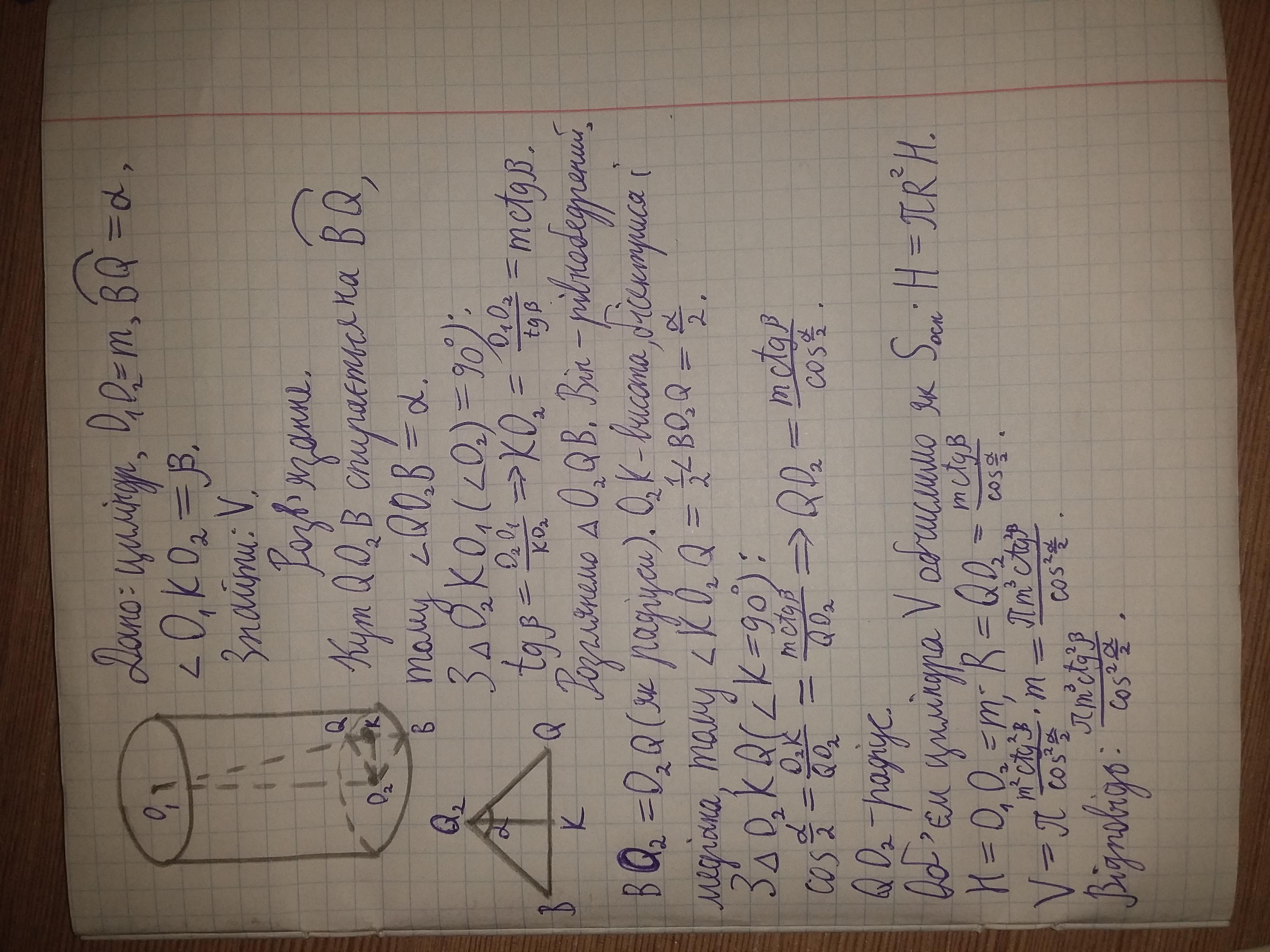 у нижній основі циліндра проведено хорду що стягує дугу градусна міра якої дорівнює а 0 градусів більше а більше 180 градусів. відрізок що сполучає центр верхньої основи із серединою даної хорди утворює з площиною основи кут бета. знайдіть обєм циліндра якщо його висота дорівнює m