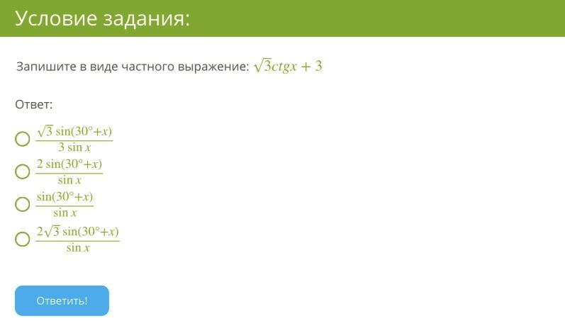 там нет правильного ответа, V3ctgx+3=V3cosx/sinx +3=(V3cosx+3sinx) /sinx