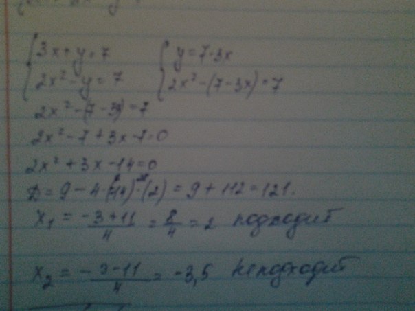 Помогите пожалуйста сейчас . Надо до завтра !!! 1. Решите систему уравнение способом сложения {внутри этой скобки написано 3х+у=7, внизу 2х2-у=7 ( 2х в квадрате)