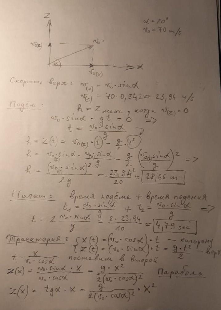 тело брошенно под углом 20 градусов к горизону с начальной скоростью 70 м/с 1.получить уравнение траектории и построить график траектории движения 2.рассчитать максимальную высоту подьема тела 3.найти длительность полета тела