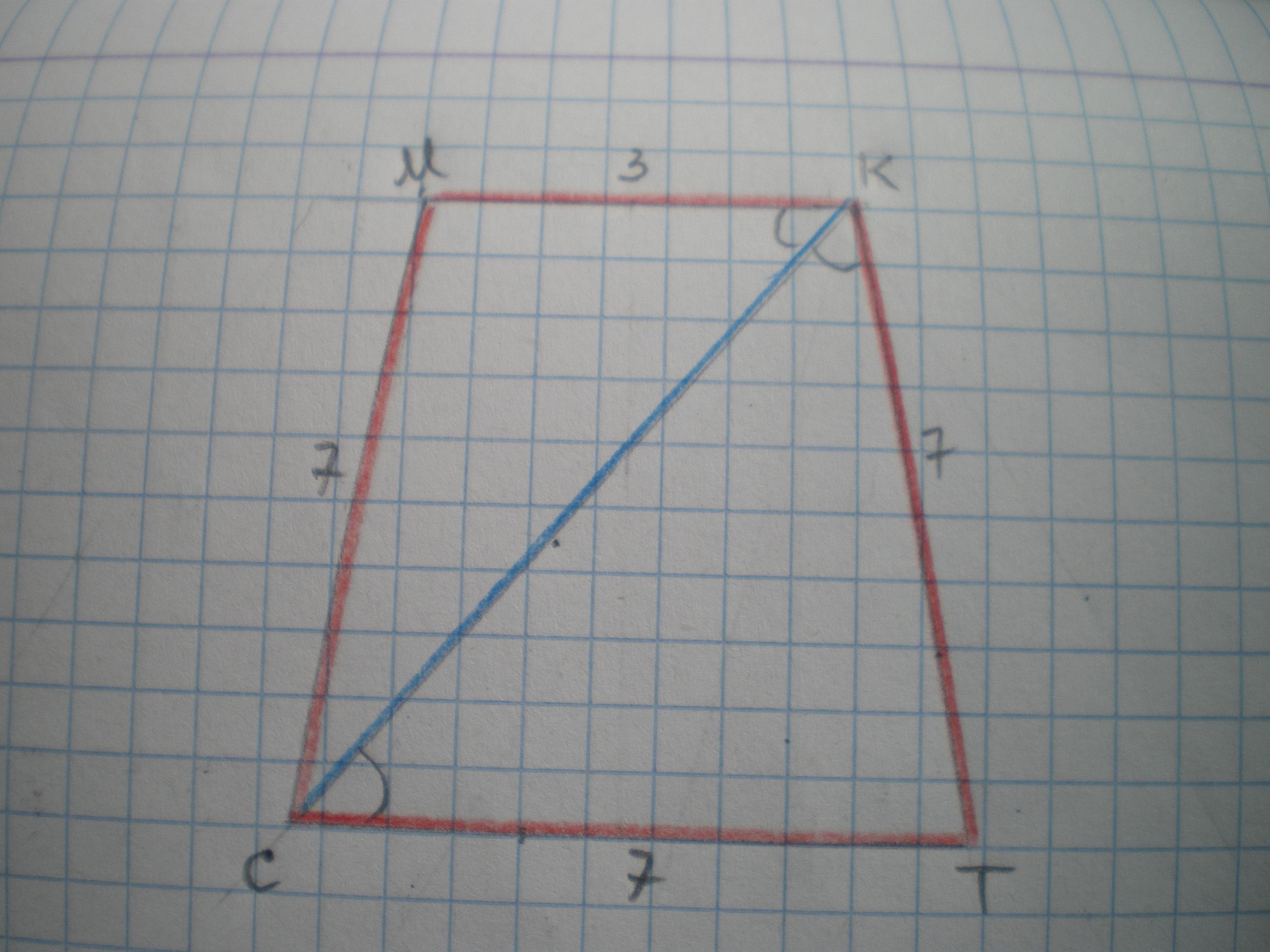Дано: СМКТ - трапеція, СМ=КТ, МК=3 см, СТ=7 см, СК - діагональ, ∠МКС=∠СКТ. Знайти Р.
