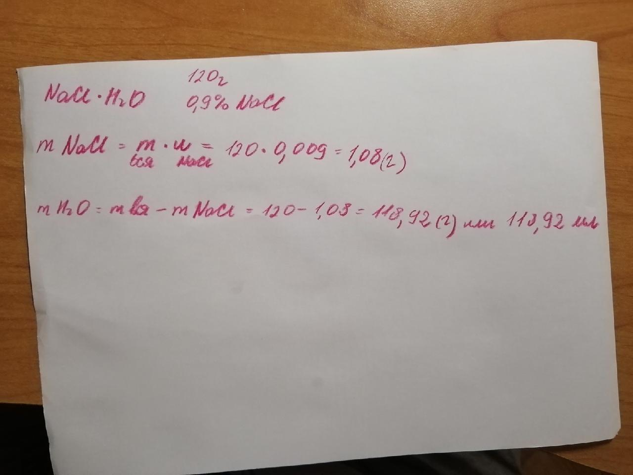 Помогите!!! найдите массу (г)хлорида натрия и объём воды (мл) воды, необходимые для приготовления 120 г физиологического раствора - водного раствора хлорида натрия (поваренной соли) с массовой долей 0,9%
