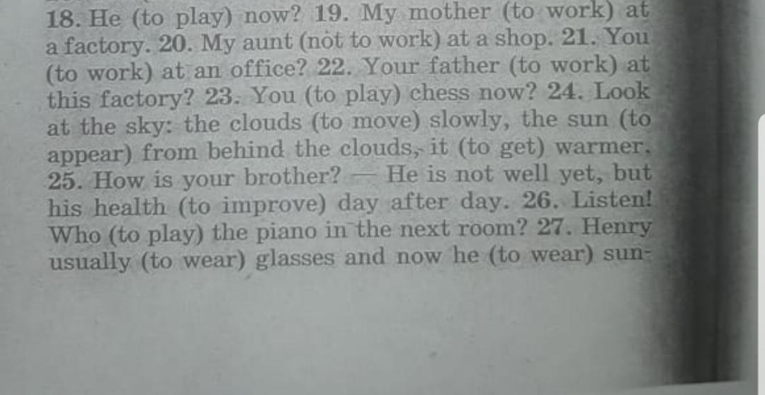 Ответ: 1. Is he playing; 2. works; 3. doesn't work; 4. Do you work..? 5. Does your father work...? 6. Are you playing...? 7. are moving, is appearing, it is getting; 8. is improving; 9. is playing...? 10. wears, is wearing.