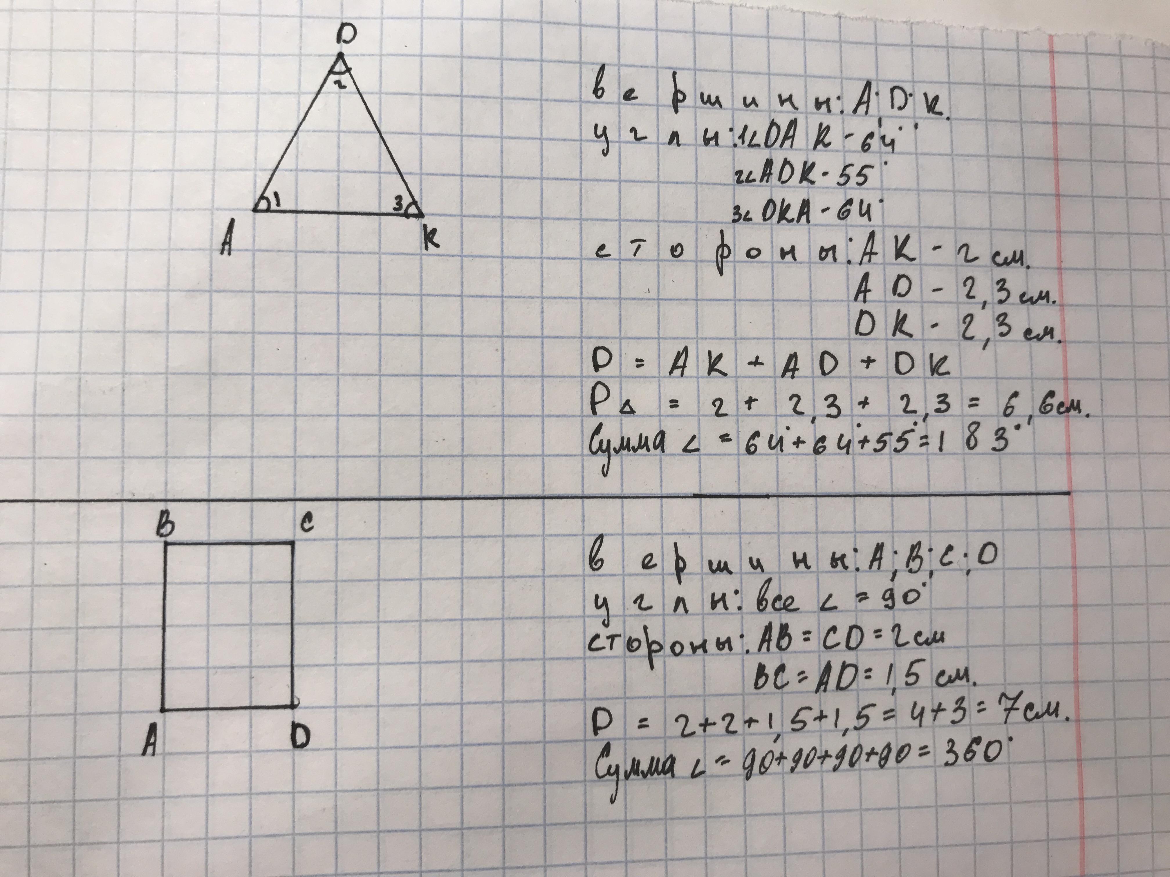построить треугольник и четырехугольник, описать каждую фигуру по плану: вершины, углы и их градусные меры, стороны и их длины, найти периметр и сумму углов каждой фигуры.