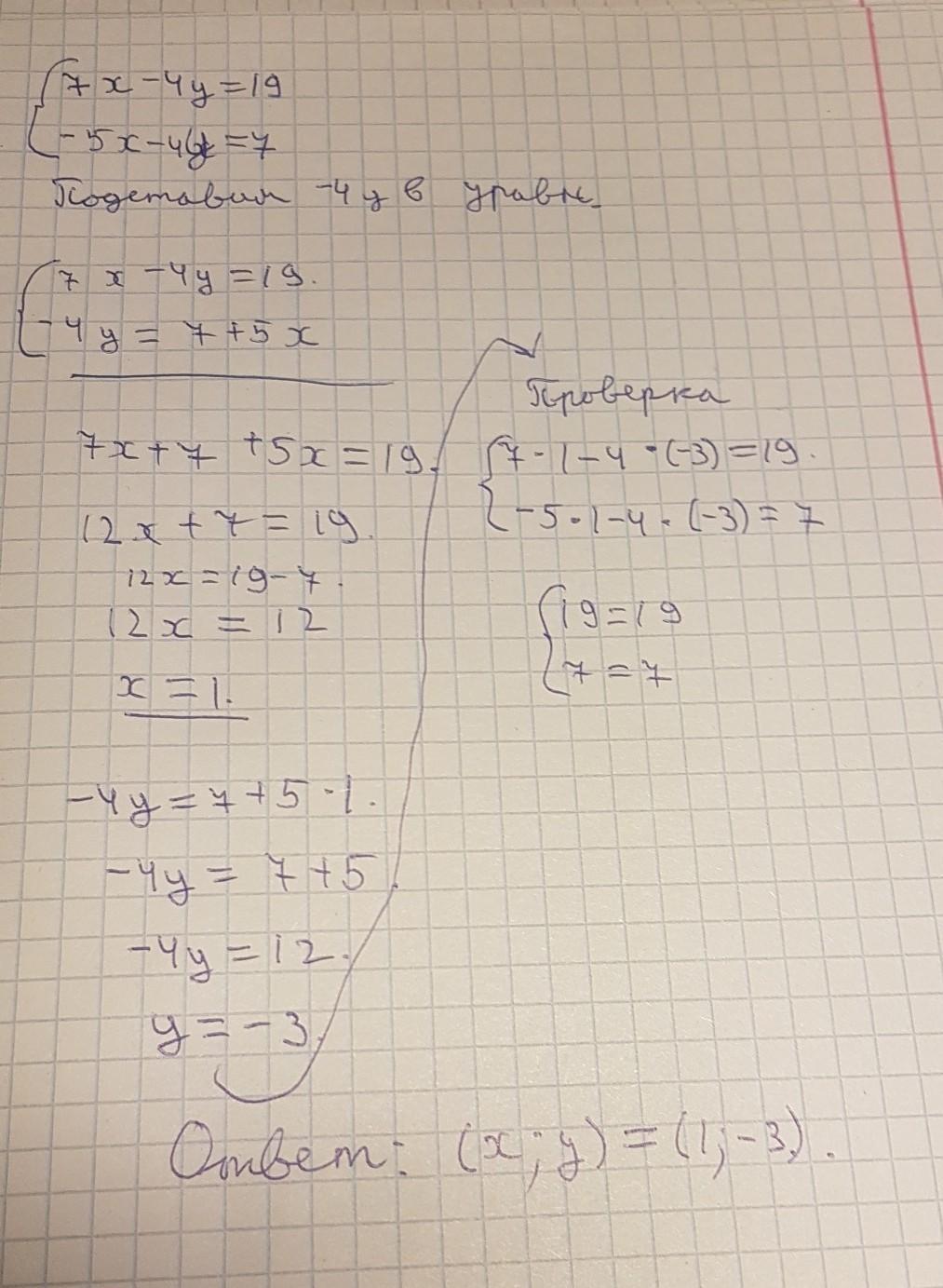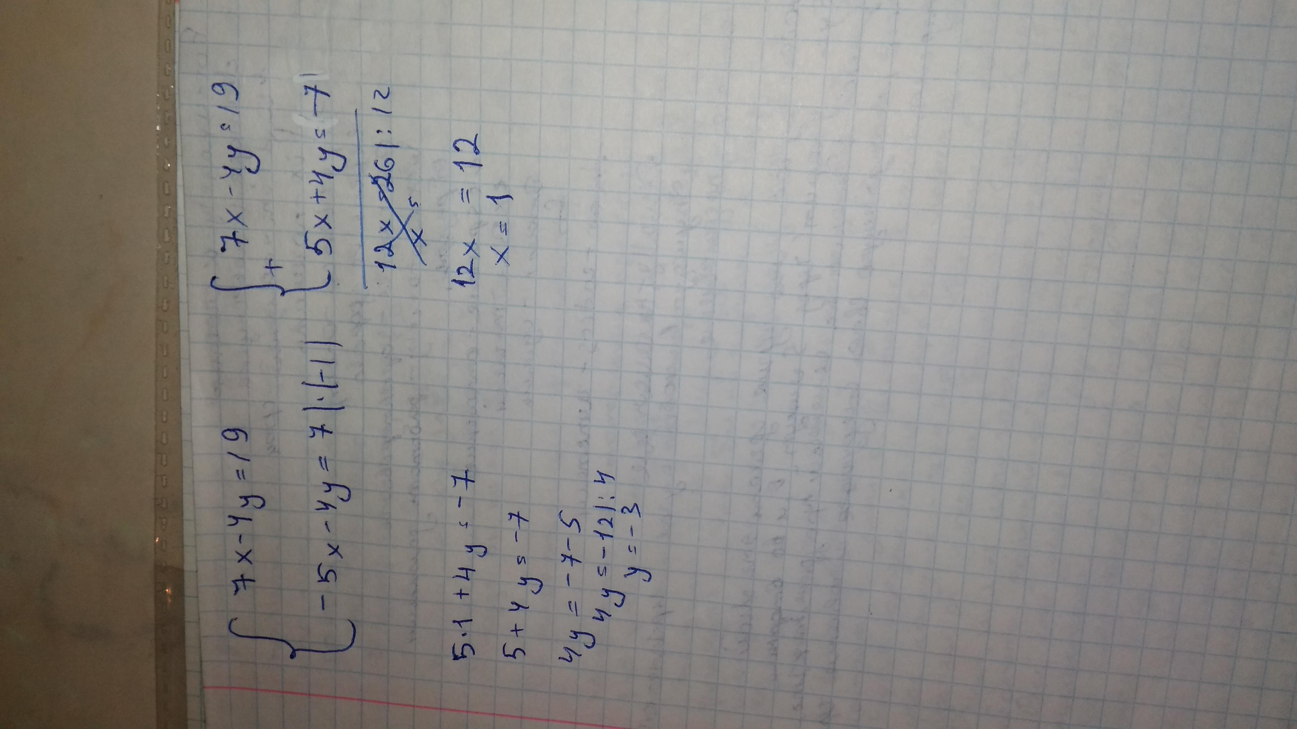 решите систему уравнений методом алгебрического сложения 7х-4у=19 . -5х-4у=7 помогите пожалуйста