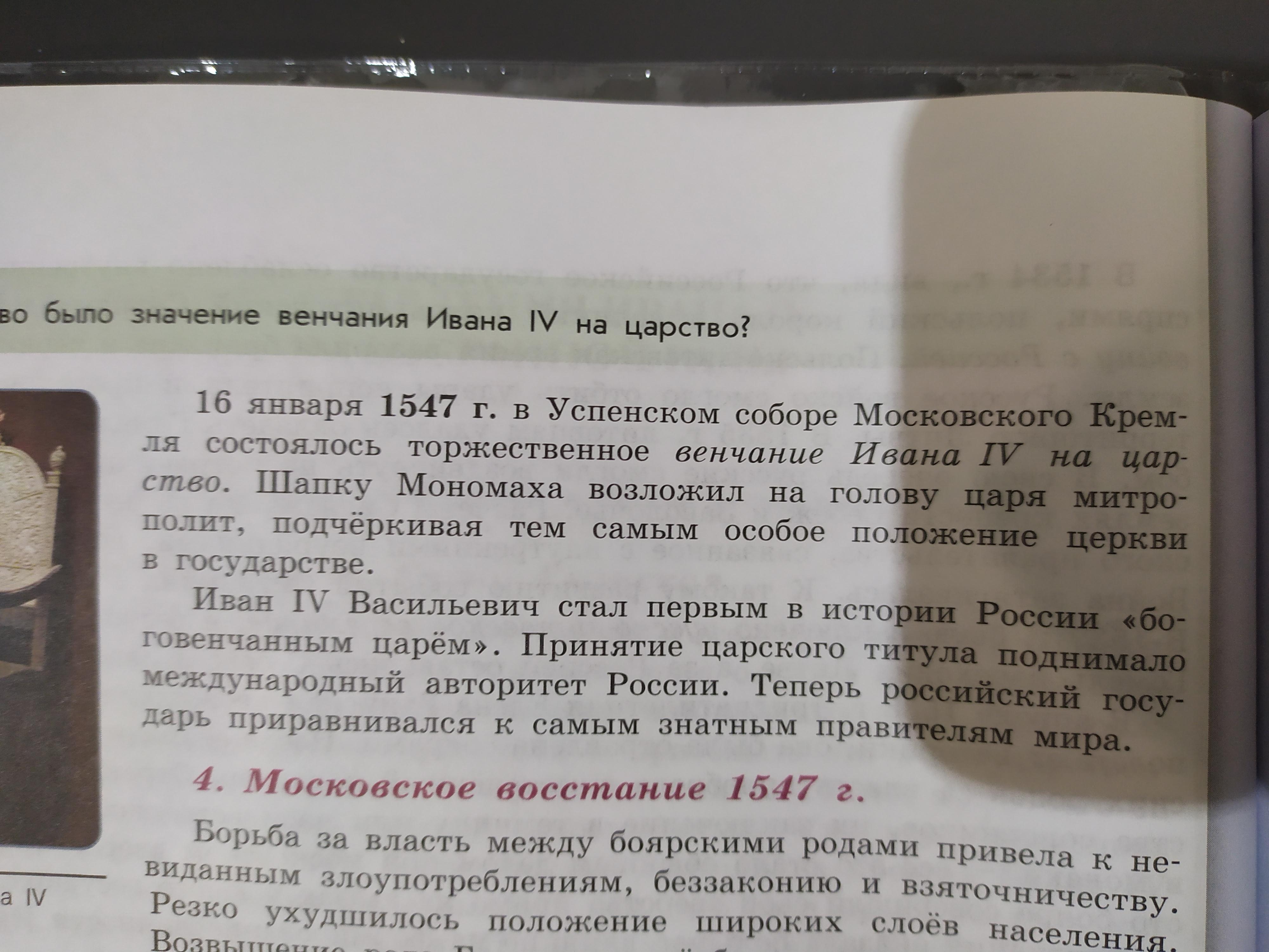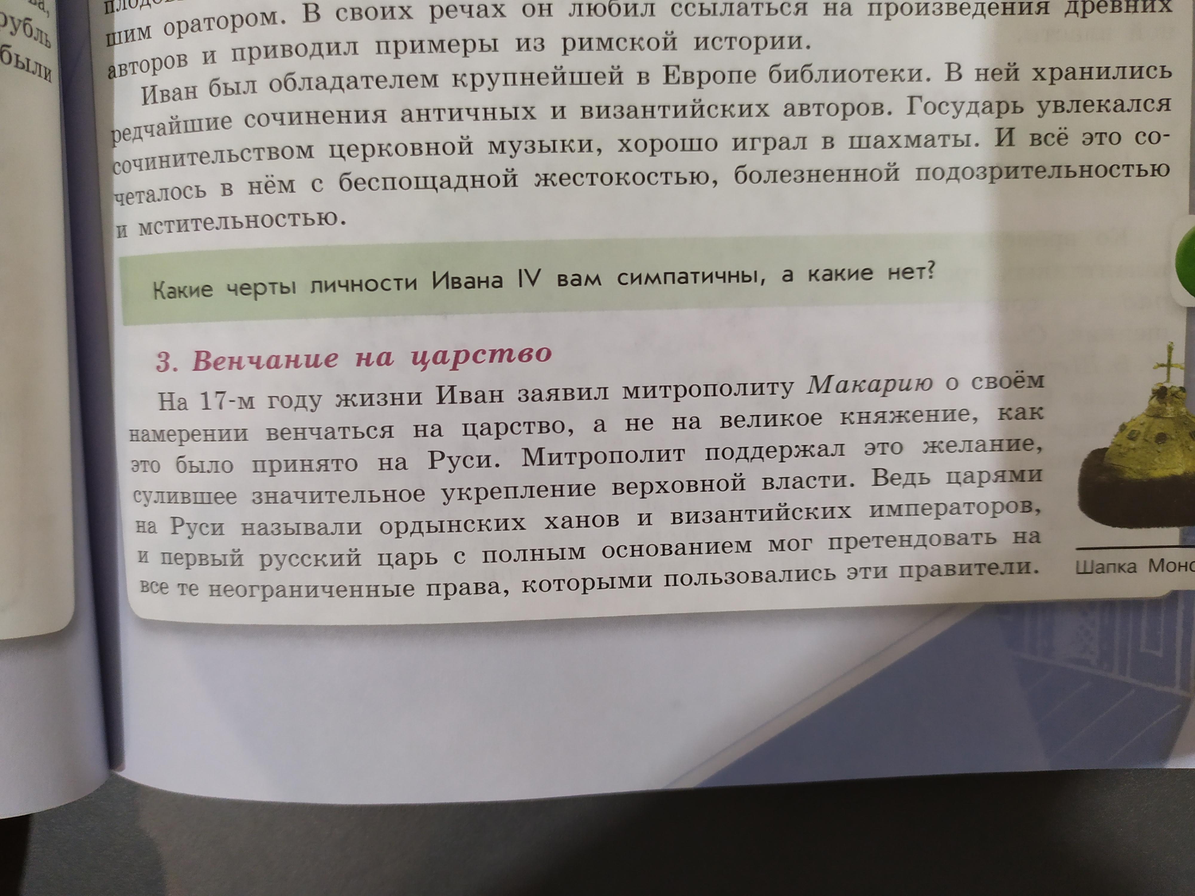 В 17 лет Иван заявил митрополиту о желании быть царем, а не князем, как было принято на Руси. Митрополит поддержал это,ведь сулило укрепление верховной власти. Так как царями на Руси звали ордынских ханов и Византийских императоров, первый русский царь мог претендовать на такие же неограниченные права.