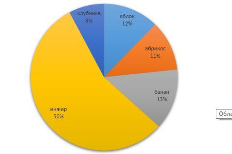 Построить круговую диаграмму вместимости сахара(г) на 100г фруктов: яблок-11,абрикос-10,банан-12,инжир-50,клубника-7