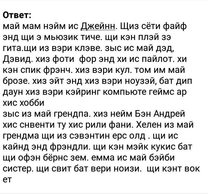 май мам нэйм ис Джейн. Щиз сёти файф энд щи э мьюзик тиче. щи кэн плэй зэ гита.щи из вэри клэве. зыс ис май дэд, Дэвид. хиз фотки фор энд хи ис пайлот. хи кэн спик фрэнч. хиз вэри кул (сейчас допишу