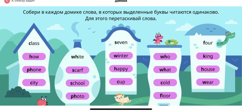 Собери в каждом домике ,слова в которых выделенные буквы читаются одинаково?пожалуйста!