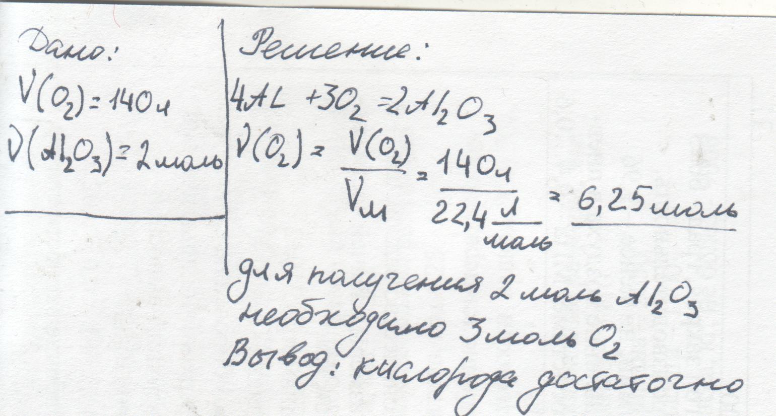Обчисліть чи вистачить кисню об’ємом 140 л для добування алюміній оксиду кількістю речовини 2 моль?