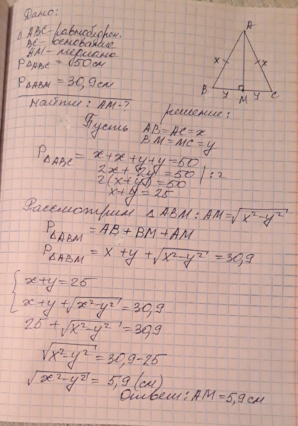 Найдите медиану AM, если периметр треугольника ABC равен 50 см,