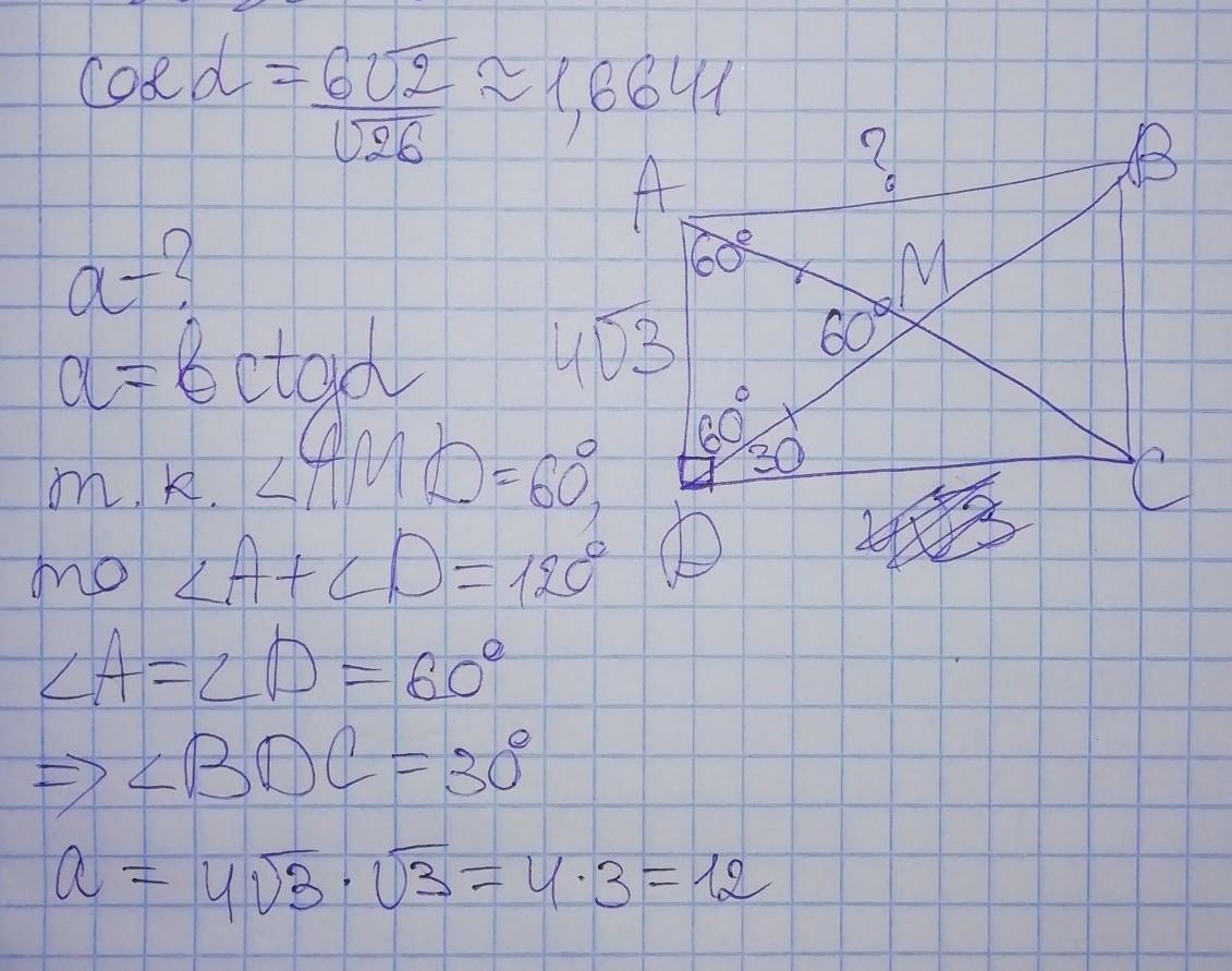 Диагонали прямоугольника пересекаются под углом 60 градусов. Найдите длину прямоугольника если ширина равна 4√3