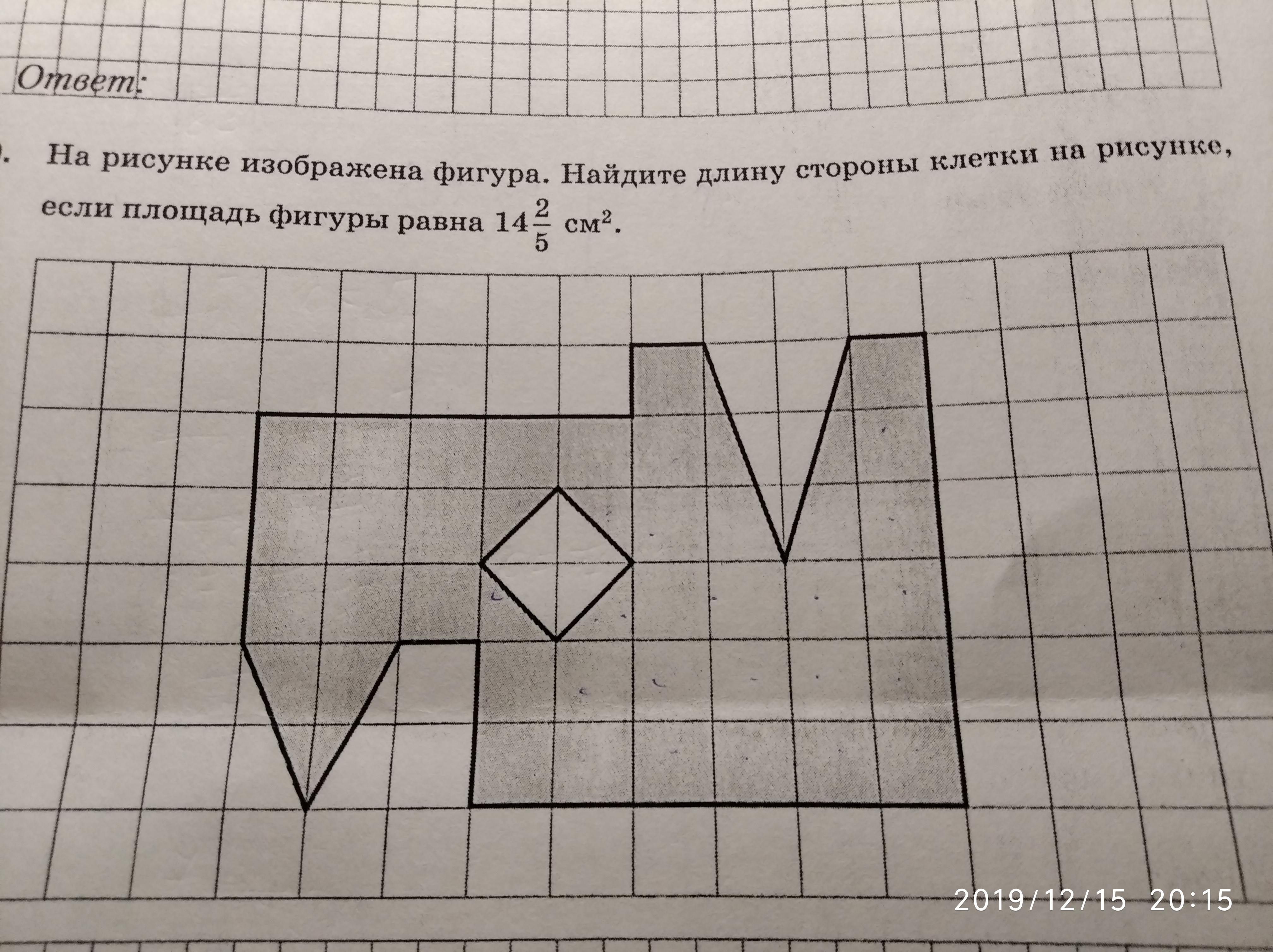 На рисунке изображена фигура . Найдите длину стороны клетки на рисунке, если площадь фигуры равна 14 2/5 см³