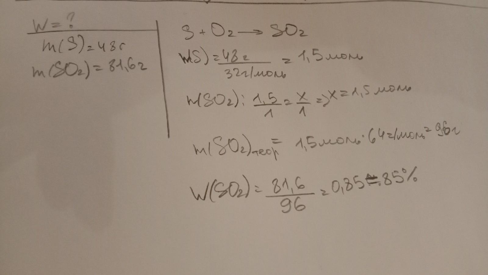 при сжигании 48 г серы в избытке кислорода получили 81,6 г сернистого газа. Вычислите выход продукта реакции от теоритически возможного.