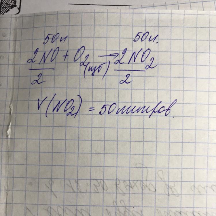 Определите объём (н.у.) газа, который образуется при взаимодействии 50 л (н.у.) оксида азота(II) с избытком кислорода.