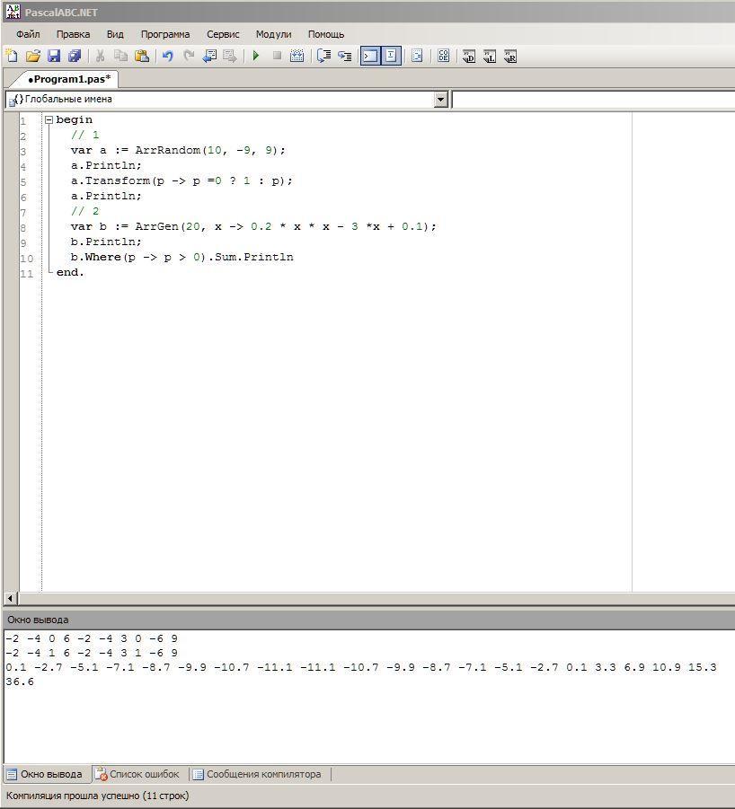 2.напишите программу заполнения массива из 20 элементов по формуле а(х)=0,2х2-3х+0,1 и подсчёта суммы положительных элементов массива.