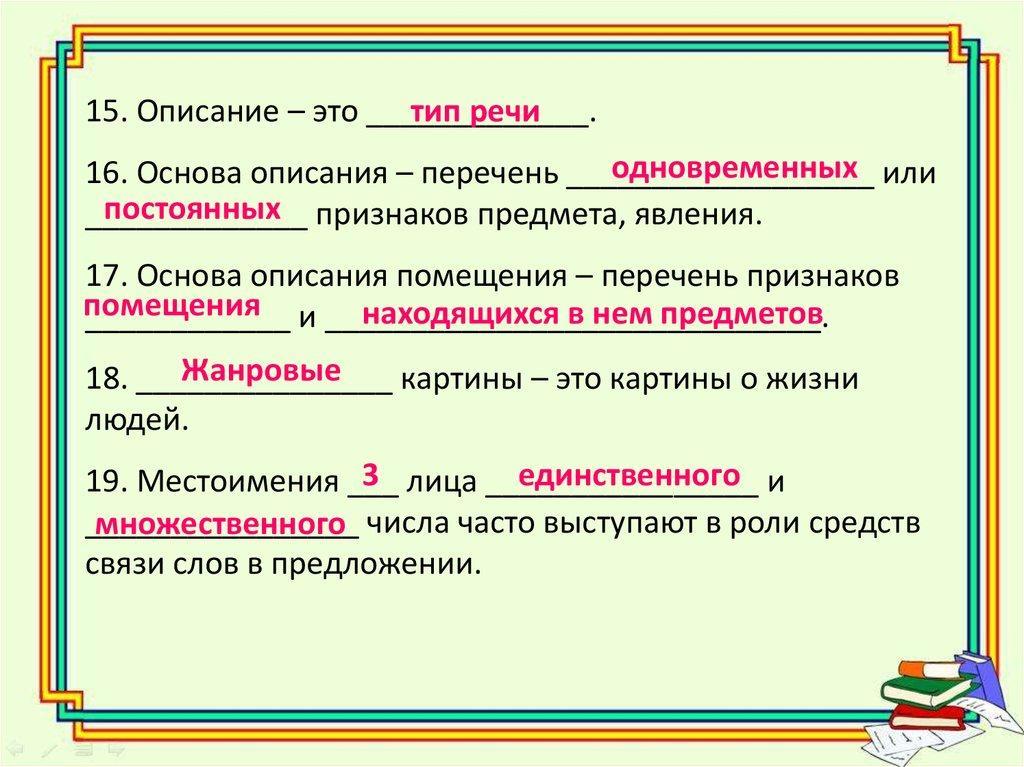 16. Основа описания – перечень __________________ или _____________ признаков предмета, явления.