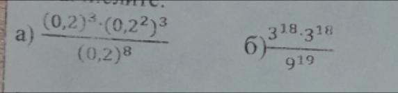 б) 1/9 дробом, тоже самое прибавляем степени, а потом отнимаем в чисельнике прибавили и вышло 3^36, а в займеннике 3^38 отнимаем степени чисельника и займеника и выходит 1/3^2 дробом, 3^2=9, значить выходит 1/9