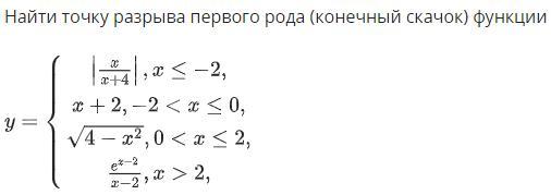 x=-2 точка разрыва первого рода, т.к. имеет место конечный скачок функции. В точках x=-4 и x=2 имеется разрыв второго рода, его нельзя устранить доопределением функции.