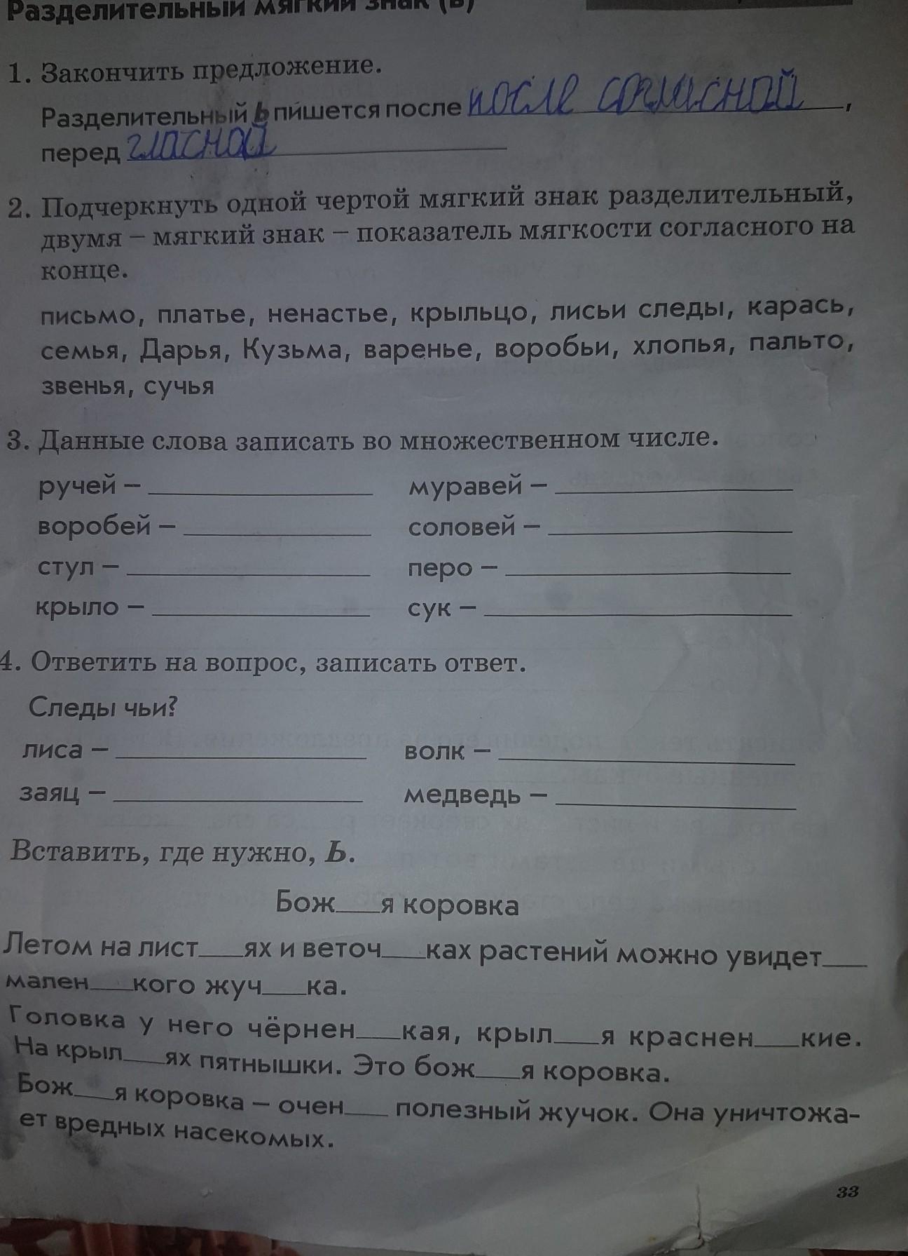 2.Разделительный - платье, ненастье, лисьи следы, семья, Дарья, варенье, воробьи, хлопья, звенья, сучья.