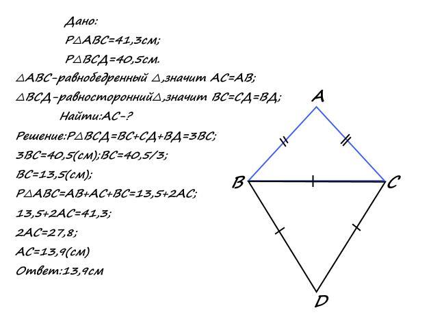 а периметр равностороннего треугольника BCD равен 40,5 см. Найдите сторону AC.