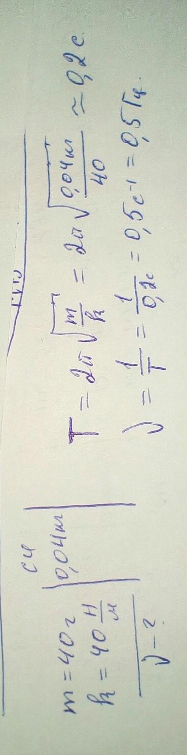 помгите решить задачу по физике: Найти частоту колебания тела массой 40г , прикрепленного к пружине с жесткостью 40Н/м (0,5 Гц)