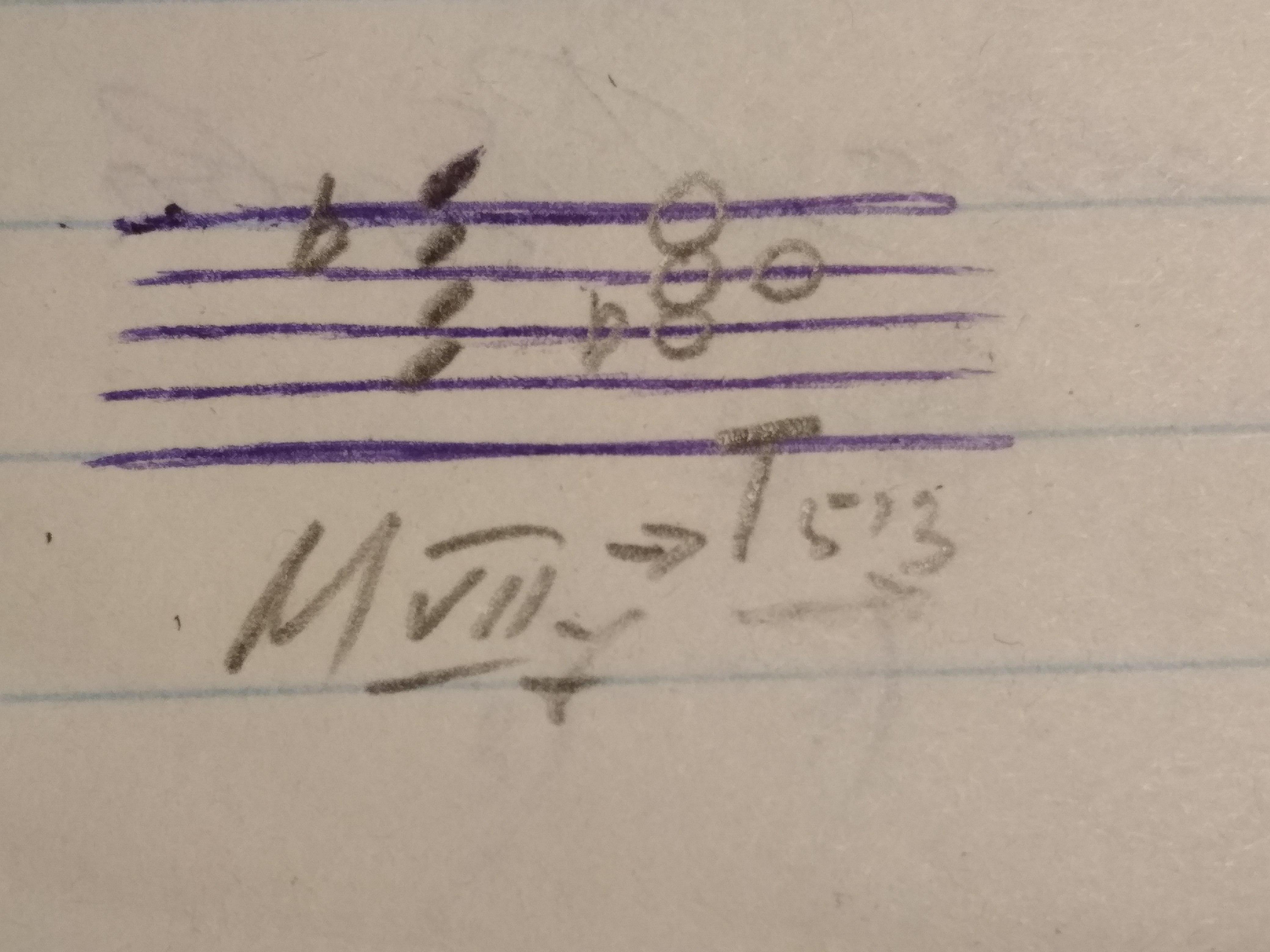 Ответ: Надо разрешить не малую септиму, а малый септаккорд 7 ступени. 1)Нужно достроить его по схеме м3+м3+б3, 2) от нижней ноты подняться на полтона и построить мажорное тоническое трезвучие с удвоенной третьей ступенью