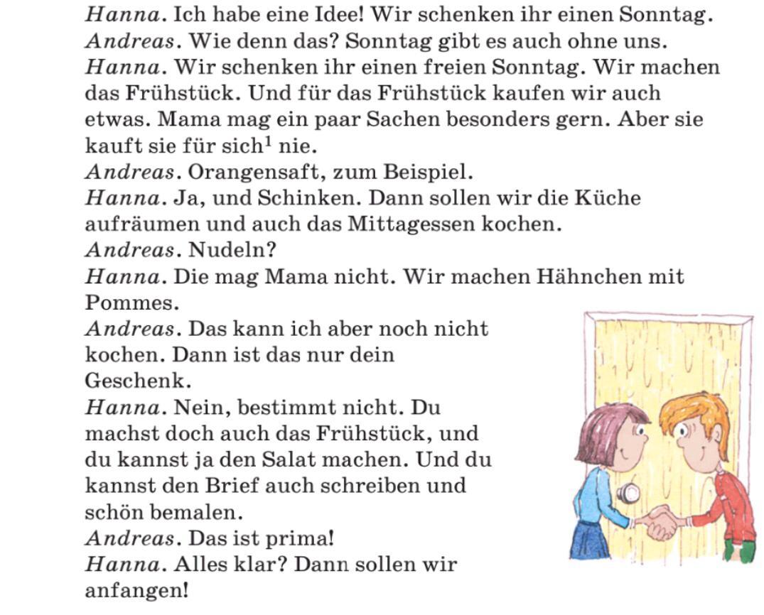 Doch dann hat sie eine Idee! Andreas und sie können Mutti einen Sonntag schenken (10)! Sie machen das Frühstück (11), und für das Frühstück kaufen sie Orangensaft (12) und Schinken. Dann sollen sie die Küche aufräumen (13) und auch das Mittagessen (14) kochen. Sie kochen keine (15) Nudeln, Mama mag die nicht. Sie machen ein Hähnchen (16) mit Pommes. Andreas macht noch den Salat (17). Und er kann (18) noch einen Brief schreiben und ihn schön bemalen (19).