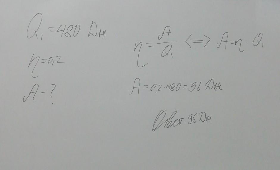 Тепловая машина получает от нагревателя за цикл количество теплоты Q=480 Дж. Ее ККДЗ равен 20%.Определить работу, выполняемую машиной за цикл.