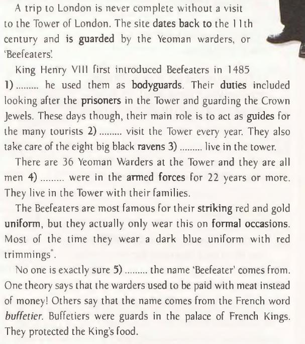 Король Хенри 8 ввел бифитеров (буквально мясопоедатели стражники в красном и с черными шапками, прикреплю фото) которых (who) он использует как телохранителей. В их задачи включались присматривание за заключёнными в Тауре и охрана королевской сокровищницы (место где короли и королевы хранили короны). В наши дни однако, их главная роль это играть охранников для многих туристов которые( which ) посещают Таур каждый год. Они также заботятся о 8 больших черных воронах которые (which) живут в тауре