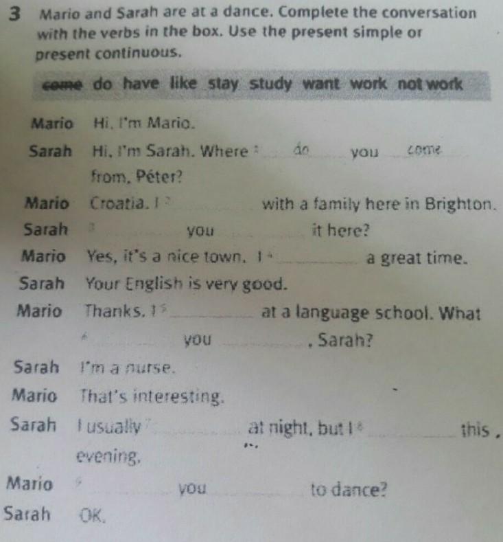 Mario: Thanks. I study at a language school. What do you work, Sarah?