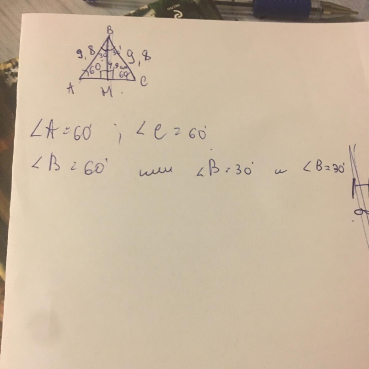 Высота, проведенная к основанию равнобедренного треугольника, равна 4,9 см, а боковая сторона треугольника равна 9,8 см. Найдите углы этого