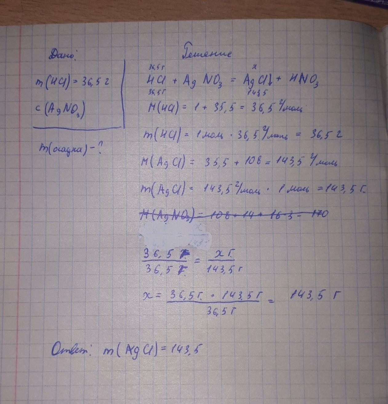 Пожалуйста помогите срочно! Вычислить массу осадка полученного при взаимодействии 36.5 г раствора соляной кислоты с раствора нитрата серебра?