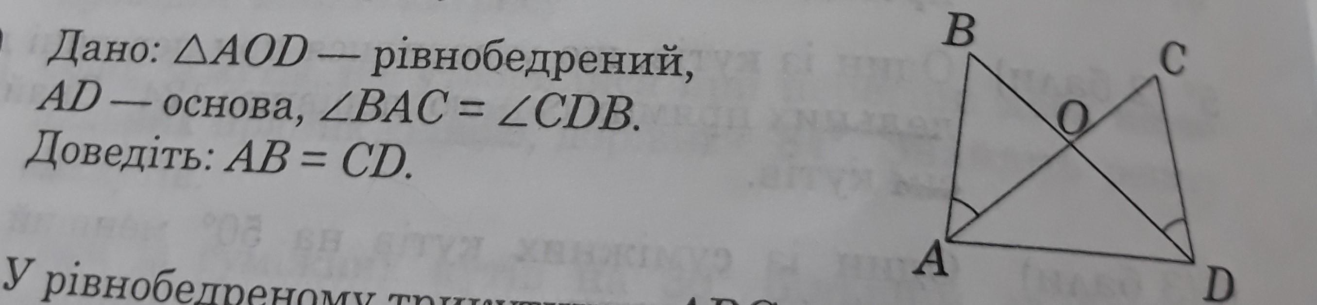 1)AO и OD выступают боковыми сторонами равнобедренного треугольника из чего следует, что они равны, а значит это равносильно и для ΔBAO и ΔCOD.