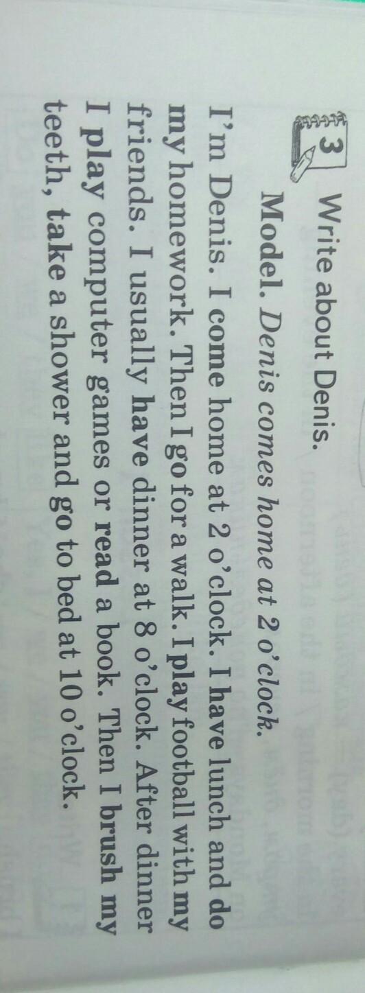 He's Denis. He comes home at 2 o'clock. He has lunch and does his homework. Then he goes for a walk. He plays football with his friends. He usually has dinner at 8 o'clock. After dinner he plays computer games or reads a book. Then he brushes his teeth, takes a shower and goes to bed at 10 o'clock