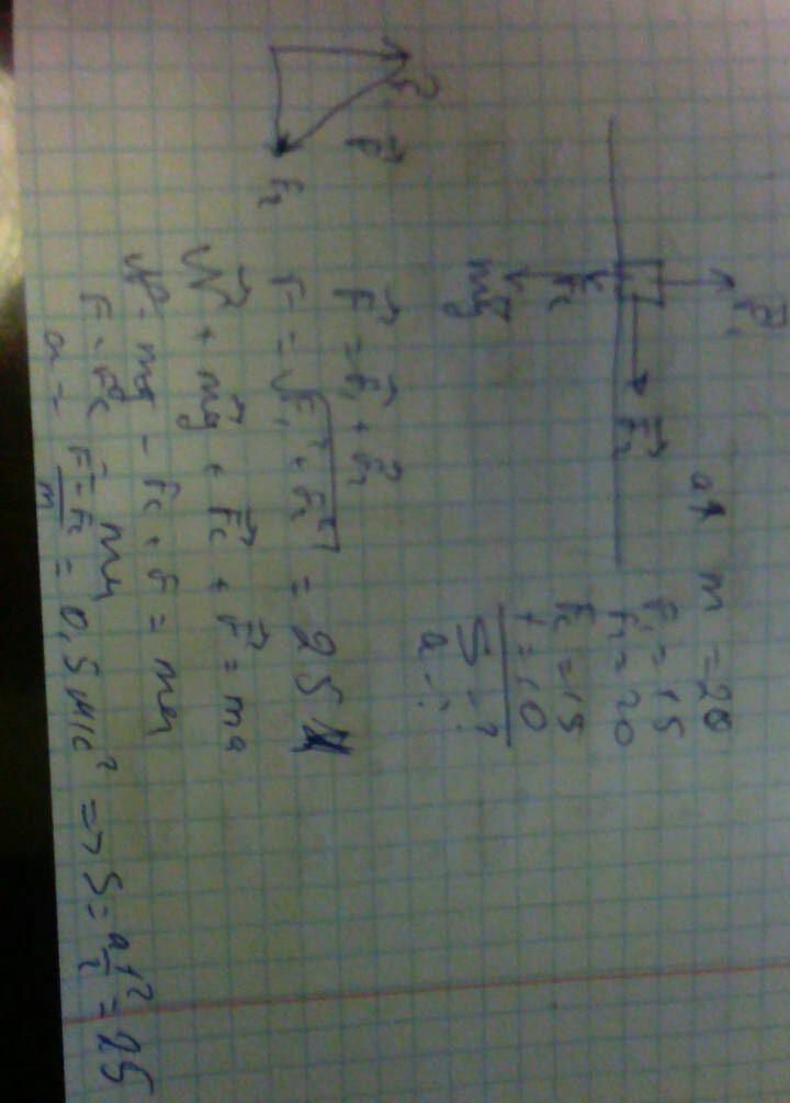 На тело действуют две силы 15 и 20 НЮ приложенные под углом 90 градусов. каким ускорением начнет двигаться (V0=0) тело, масса которого 20 кг, если сопротивление среды 15 Н? Какой пут пройдет тело за 10 с?