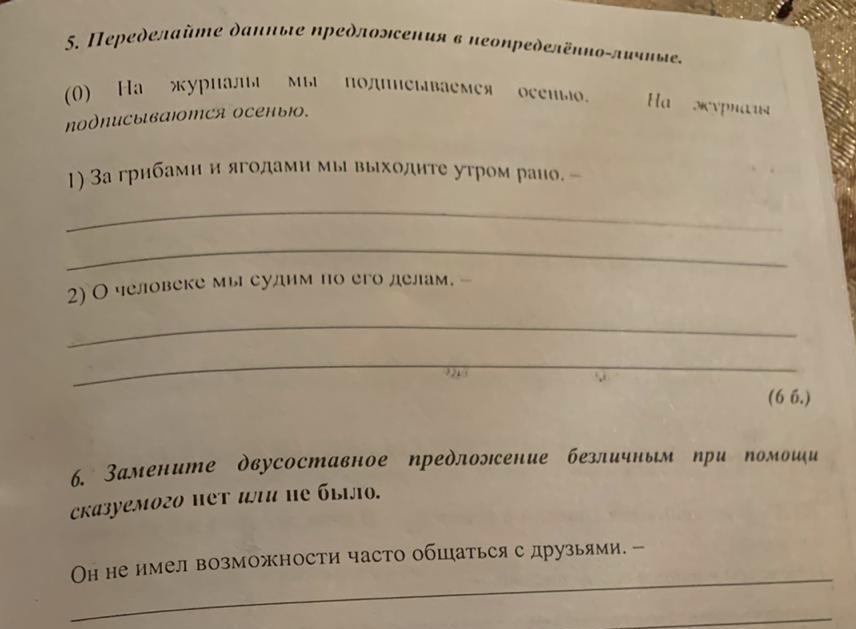 Ну мне так кажется , тип у тебя там есть образец , и по нему можно было понять что в 5 номере просто нужно было убрать местоимения , а в 6 номере нужно было чуть изменить форму некоторых слов , убрать "не имел" и вставить "нет" . Я конечно тебе советую подождать других ответов , потому что я полностью не уверена в своём ответе , а так если напишешь мой ответ , то потом скажи какая оценка и правильно ли я ответила )