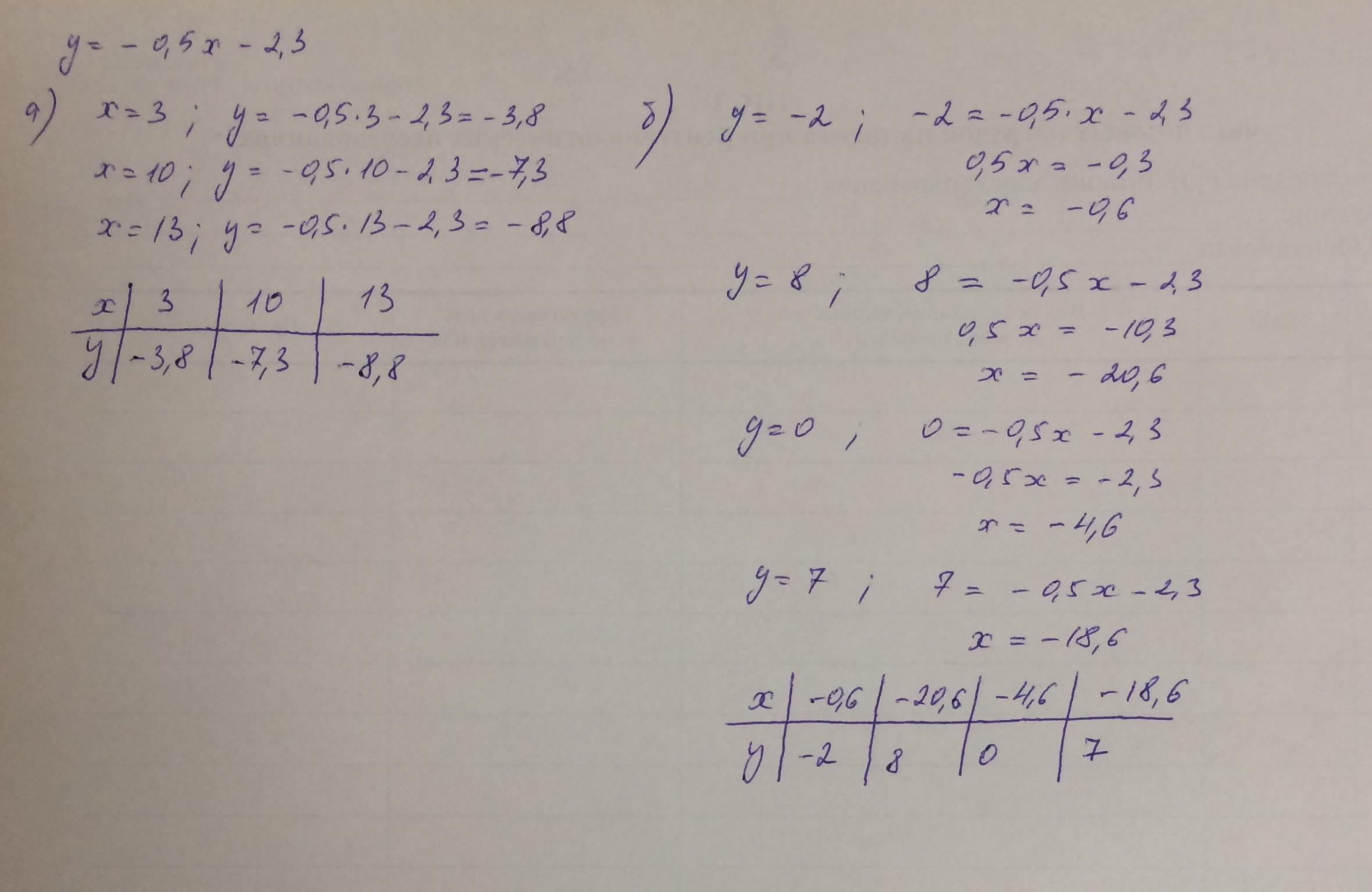 Функция задана формулой. Y=-0.5x-2.3. Найдите: а) значение функции при x равном - 3,10,13 б) значение аргумента, при котором y равен - 2,8;0;7