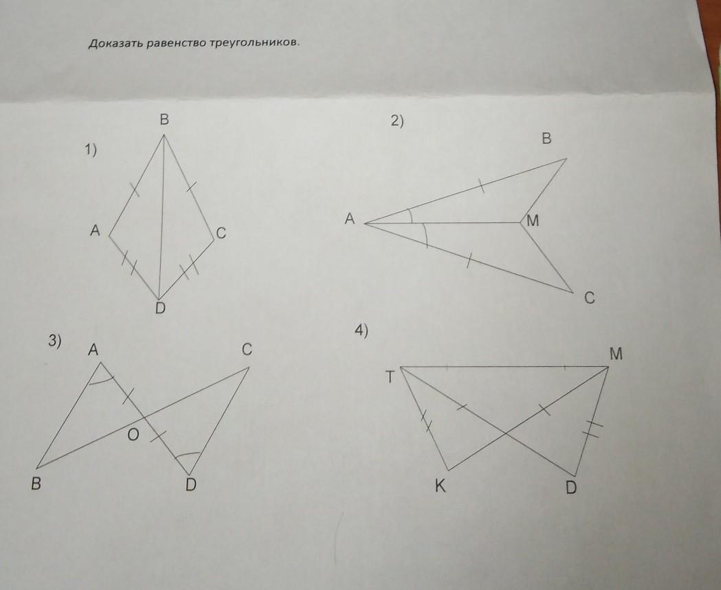 4)Поставим точку О по центру,значит треугольник ТОМ равнобедренный,а известно, что у равнобедренного треугольника углы при основании равны,то те которые будут им сумежные,тоже равны,значит триугльники КТО и ОМД равны за 2 сторонами и углом между ними (1 признак равенства)
