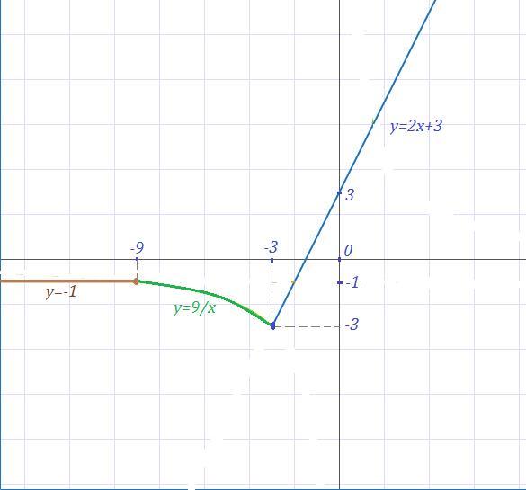 **На 2м уч-ке кусочек гиперболы у=9/х, (-9;-1)...,...(-3;-3), крайние точки выколотые, не принадлежат гиперболе