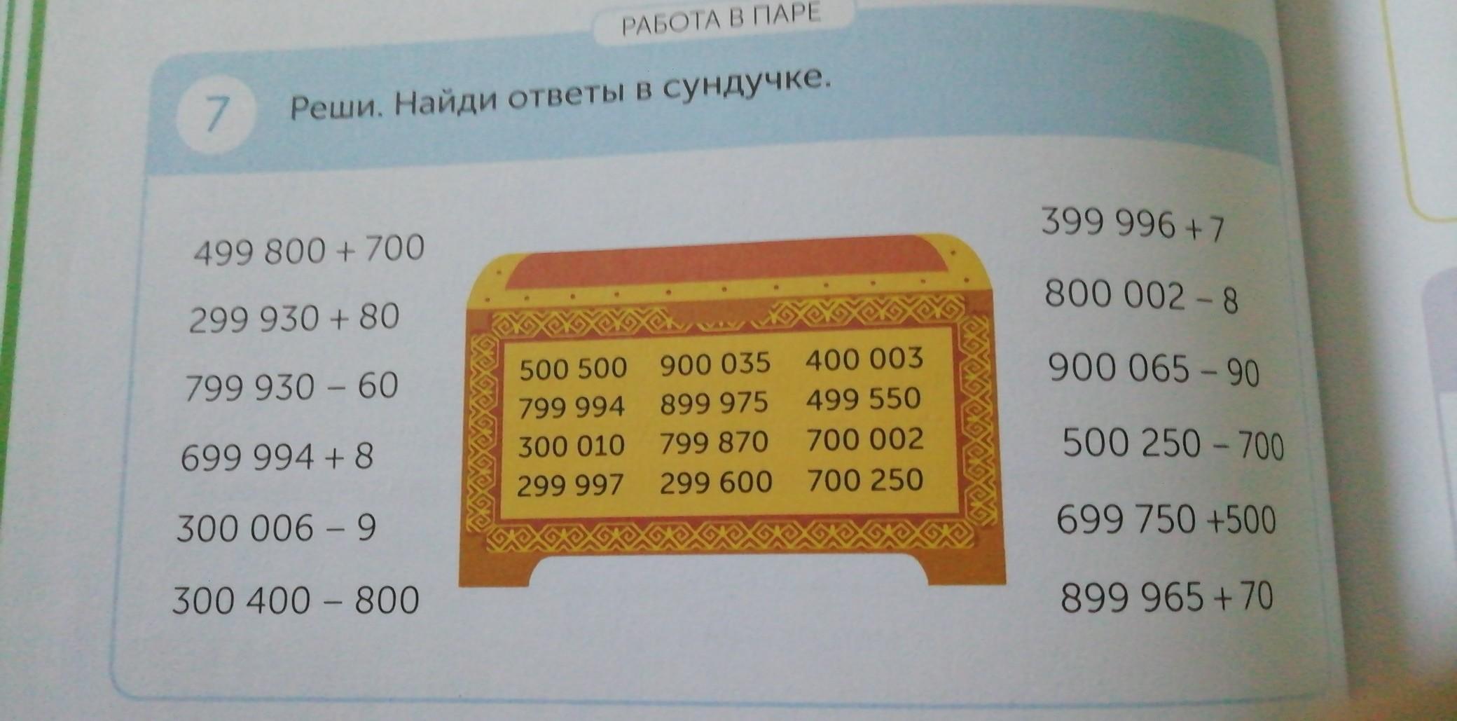 Ответ:499800+700=500500;299930+800=300010; 799930-60=799924; 699994+8= 700002; 300006-9=299997; 300400-800=299600, 399996+7=400003; 800002-8=99994; 900065-90=899975; 500250-700=499550; 699750+500=700250; 899965+70=900035