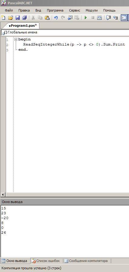 После ввода нуля на следующей строке будет выдана сумма. Числа можно вводить и в строку, но в любом варианте, если в строке после нуля набрать еще цифры, в сумму войдут лишь те, которые шли до первого встреченного нуля.