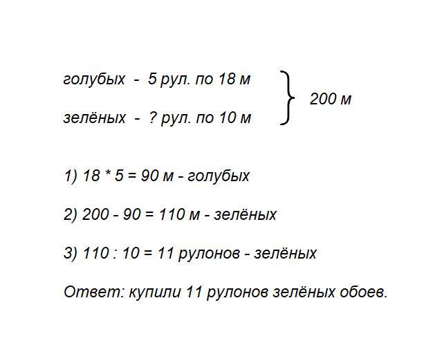 для ремонта купили 5 рулонов голубых обоев по 18 метров в каждом и нисколечко рулонов зеленых,по 10 метров в каждом.Всего 200 метров обоев.Сколько рулонов зеленых обоев купила?