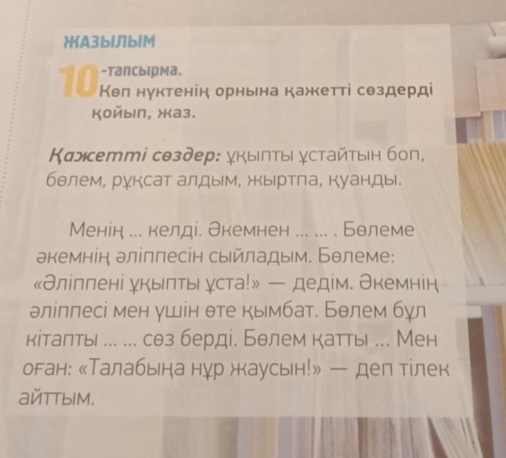 Менің бөлем келді. Әкемнен рұқсат алдым. Бөлеме әкемнің әліппесін сыйладым. Бөлеме әліппені ұқыпты ұста дедім. Әкемнің әліппесі мен үшін өте қымбат. Бөлем бұл кітапты ұқыпты ұстайтын боп сөз берді. Бөлем қатты қуанды. Мен оған Талабыңа нұр жаусын деп тілек айттым.