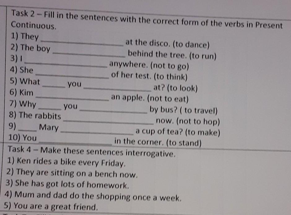 Ken doesn’t ride a bike every Friday. They aren’t sitting on a bench now. She has not got lots of homework. Mum and Dad don’t do the shopping once a week. You aren’t a great friend.