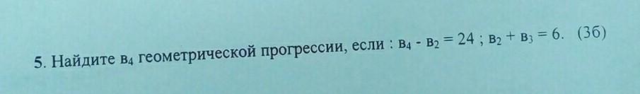 \left \{ {{b_4-b_2=24} \atop {b_2+b_3=6}} \right.\; \; \left \{ {{b_1q^3-b_1q=24} \atop {b_1q+b_1q^2=6}} \right.\; \; \left \{ {{b_1q(q^2-1)=24} \atop {b_1q(1+q)=6\; \; }} \right.\; \; \left \{ {{b_1q(q-1)(q+1)=24} \atop {b_1q(1+q)=6\qquad }} \right. \\\\\frac{b_1q(q-1)(q+1)}{b_1q(1+q)}=\frac{24}{6}\; \; \to \; \; \; (q-1)=4\; ,\; \; q=5\\\\b_1=\frac{6}{q(1+q)}=\frac{6}{5\cdot 6}=\frac{1}{5}\\\\b_4=b_1q^3=\frac{1}{5}\cdot 5^3=25