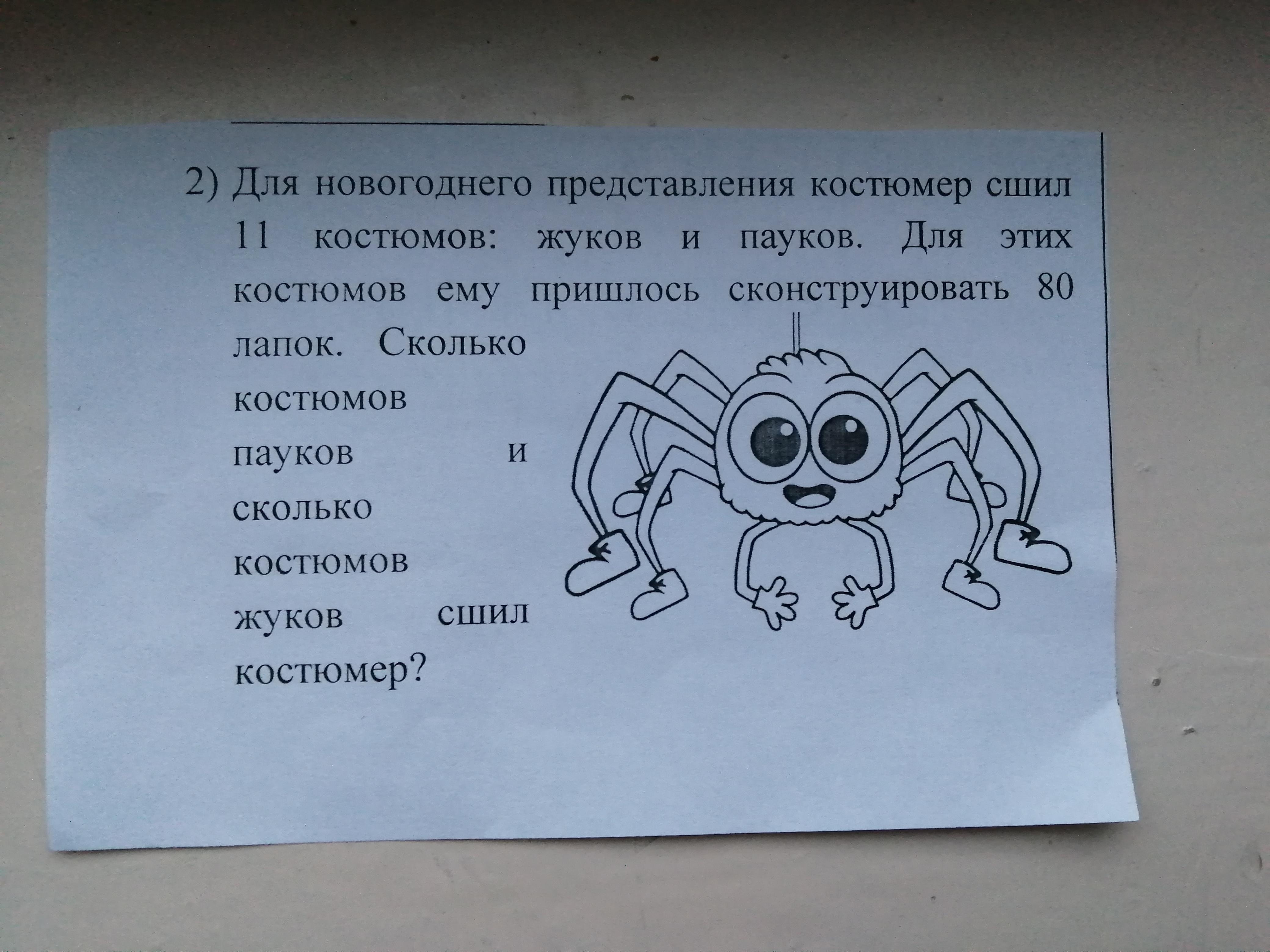 Легко 9 костюмов паука и 2 жука: всего костюмов 11, а лап 80; 9 костюмов × 8 лап паука = 72 лап всего у всех костюмах паука; 2 костюма жука × 4 лапы жука = 8 лап всего у всех костюмах жука. 72 + 8 = 80 всё сходится. 9 костюмов пауков и 2 костюма жука
