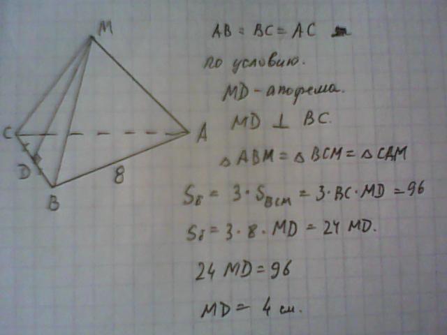 MABC правильная треугольная пирамида, d - середина ребра bc, ab=8, площадь боковой поверхности= 96, найти апофему
